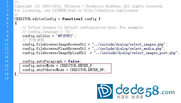 dedecms V5.7 SP1的Ckeditor编辑器有些改动,默认为回车键换行、Shift+Enter换段落,但各位站长朋友都习惯了直接敲回车换段落,查看后发现它的配置文件里是可以修改解决的,其实你可以把下面的代码注释掉就可以采用另外一种模式了(enter换段落):