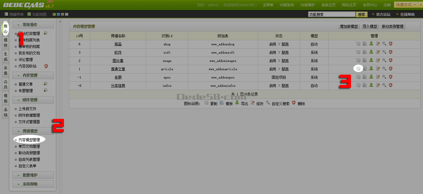 核心 – 频道模型 – 内容管理模型 – 复制普通文章数据表,如图所示: