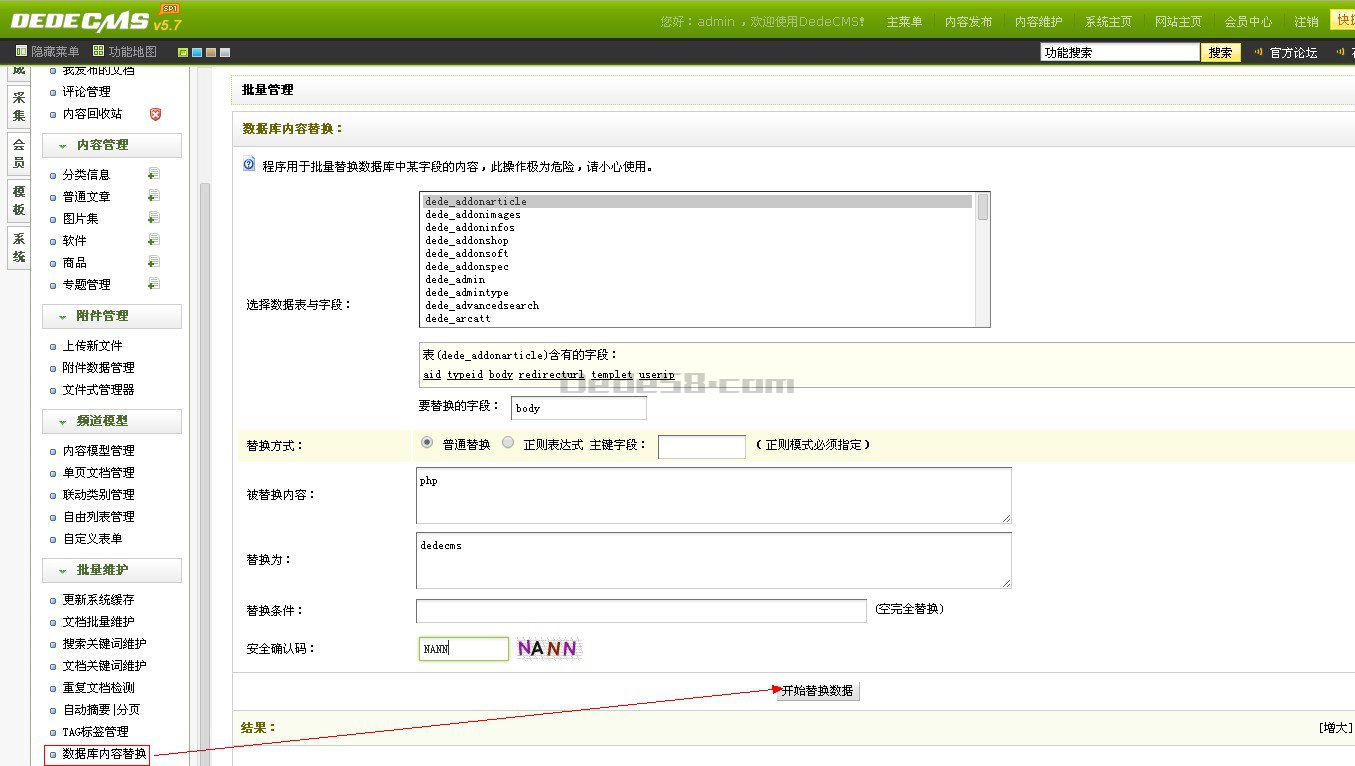 今日来教大家如何在后台批量替换文章内容里的关键词。 首先我们打开网站后台在菜单栏里面找到批量维护->数据库内容替换。 然后我们来选择dede_addonarticle这张表,很多站长可能修改过前缀了,那么选择相应的前缀_addonarticle 然后找到body这个字段,这个字段就是文章的内容的字段,然后被替换内容加入你要修改的关键词,替换为替换后的关键词