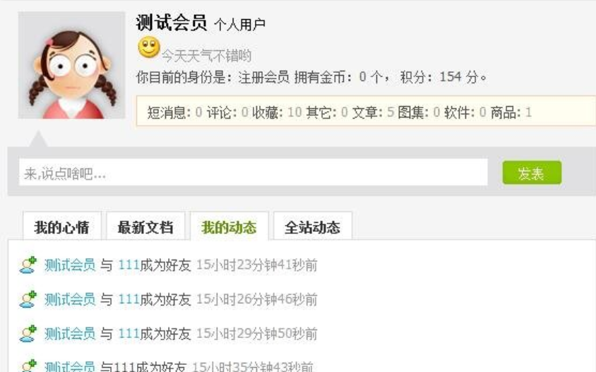 对会员心情还应该有删除功能,有兴趣的童鞋可以参考一下“我的动态”的删除方法。另外“我的心情”不建议全站动态显示,这样给一些会员乱发心(lao)情(sao)就不好了。可以对会员动态需要审核:后台-系统-系统基本设置-会员设置,“会员动态是否许需要审核”选择是。