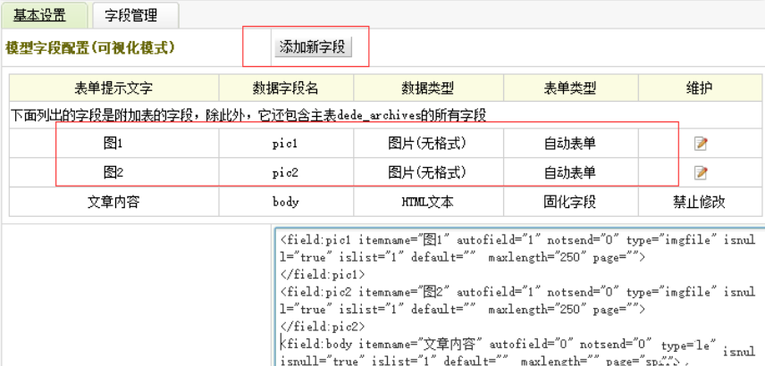字段为pic1,pic2,数据类型都为图片无格式。加上默认的缩略图,一共是三张图片。