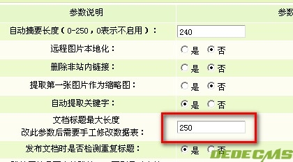 2)步骤2:进入dedecms后台,系统——系统基本参数——其他选项——文档标题最大长度——在这修改为250或更大。