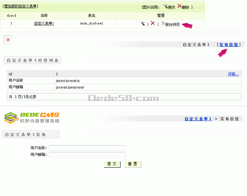 dedecms自定义表单模板:     templets/plus/view_diyform.htm内容模板   templets/plus/post_diyform.htm发布模板   templets/plus/list_diyform.htm 列表模板     dedecms自定义表单使用步骤:1.  你得建个自定义表单 2. 点击  前台预览 — 发布信息