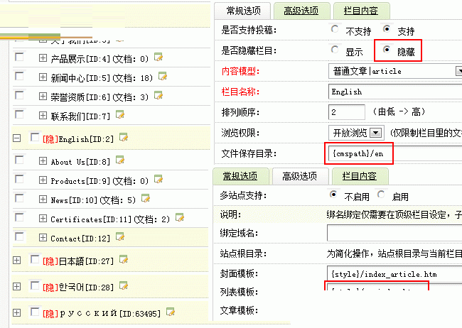 三、剩下的就是分别建设每种语言下的栏目