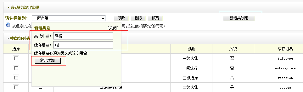 先在后台的“联动类别管理”里新增“类别组”,“类 别 名”填中文,“缓存组名”填英文字母。