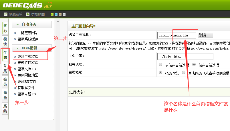第一,织梦的的首页默认的模板文件是index.htm 所以一般你要改首页的模板文件就要打开这个index.htm,但是不是首页绝对就是这个名字,因为模板文件的名字是可以修改的,确定的方法就是点开生成,如图: