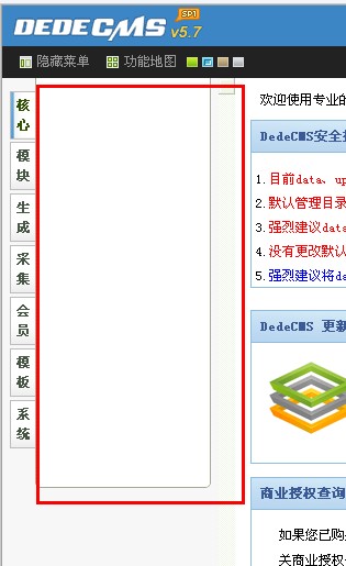 安装好dedecms后,进入后台你发现左边菜单一片空白,显示不出来,这是怎么回事?怎么解决呢?遇到这种现象一般是空间的权限问题,没有写入权限,修改一下空间的目录权限就可以了,先来看下截图