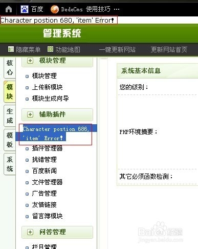 服务器环境:Apache/2.4.4PHP/5.5.3dedecms/v5.7 具体的原因没找到,断点跟踪代码发现:是这两个文件的问题/admin/inc/inc_menu.php line 77/admin/inc/inc_menu_map.php line 134 解决方法:删除这行代码:<m:item name=’系统错误修复[S]’ link=’sys_repair.php’ rank=’sys_verify’ target=’main’ />或者下面两行代码对换下位置即把 <m:item name=’病毒扫描[S]’ link=’sys_safetest.php’ rank=’sys_verify’ target=’main’ /> <m:item name=’系统错误修复[S]’ link=’sys_repair.php’ rank=’sys_verify’ target=’main’ />改成 <m:item name=’系统错误修复[S]’ link=’sys_repair.php’ rank=’sys_verify’ target=’main’ /> <m:item name=’病毒扫描[S]’ link=’sys_safetest.php’ rank=’sys_verify’ target=’main’ />