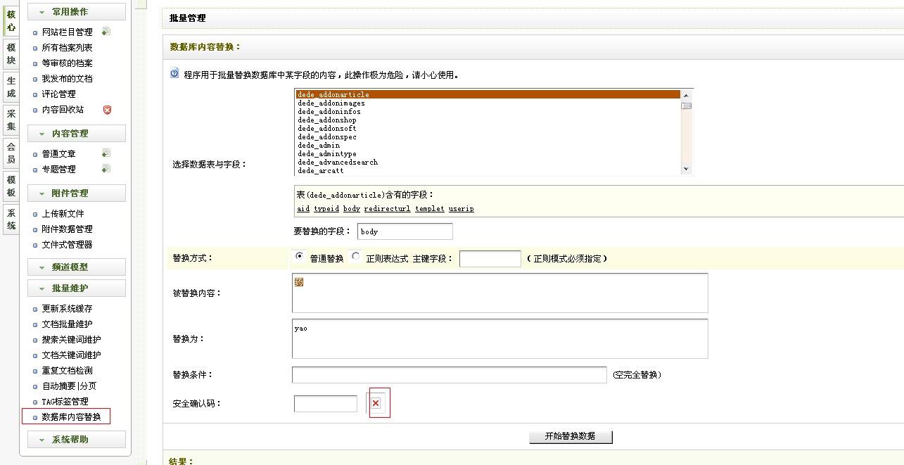 这样即可完美解决,dede后台采集数据库内容批量替换,验证码就不用填写,直接可以开始替换数据。