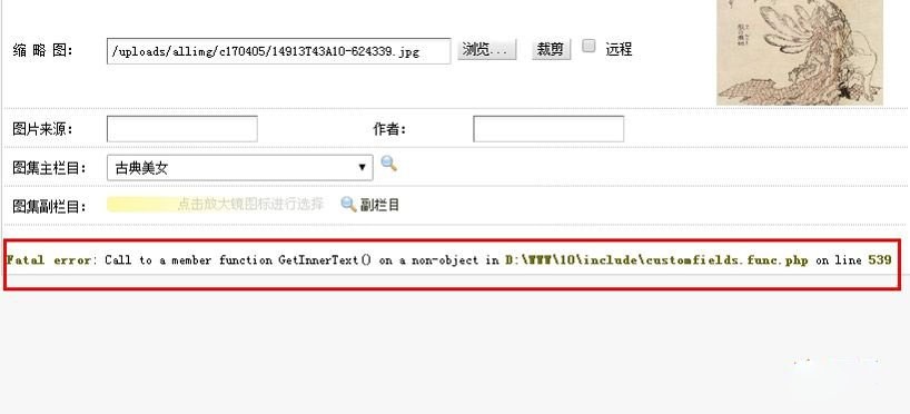织梦修改或者添加了自定义字段为图片或者添加自定义表单后在后台修改文章的时候出现如下错误:Fatal error: Call to a member function GetInnerText() on a non-object in \include\customfields.func.php on line 539