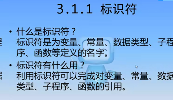 标识符为变量,常量,数据类型,子程序,函数等定义的名字。