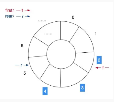 其实意思就是,在有限的数组空间范围内,当我们达到数组的最大值时,将新的数据保存回之前的下标位置。比如图中我们有 6 个元素,当前队头在 2 下标,队尾在 5 下标。如果我们入队一个元素,队尾移动到 6 下标。再添加一个元素的话,队尾移动回 0 下标,如果继续添加的话,当队尾下标等于队头下标减 1 的时候,我们就认为这个队列已经满了,不能再增加元素了。