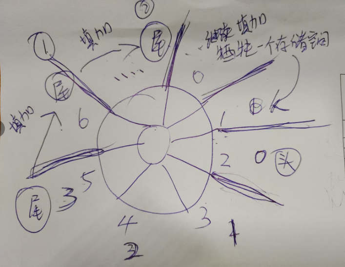 相信已经有不少同学看出来了。队列操作只是修改队头和队尾的指针记录,但是数组会一直增加,这样如果一直增加的话,就会导致这一个数组占满内存,这肯定不是一个好的队列实现。其实,在 C 语言中,数组就是要给一个固定的长度的。而 PHP 中的数组更像是一个 Hash 结构,所以它是可以无限增长的,并不需要我们在一开始定义一个具体的数组长度。这也是 PHP 的方便之处,不过如果我们不想浪费内存空间的话,应该怎么办呢?就像在 C 语言中一样,我们在 PHP 中也为数组指定一个长度,并且使用非常经典的“循环队列”来解决队列数组的存储问题。就像下图所示: