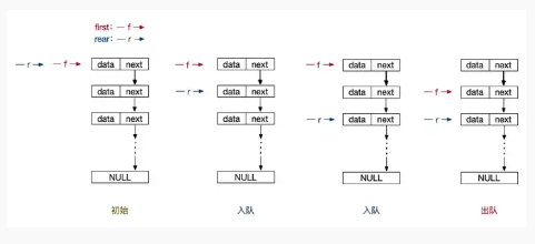 出、入队的代码函数和测试代码就一并给出了,是不是非常的简单。初始的队头元素依然是一个空节点做为起始节点。然后入队的时候,让 rear 等于新创建的这个节点,并在链表中建立链式关系。出队的时候也是同样的让 first 变成当前这个 first 的下一跳节点,也就是 first->next 就可以了。判断队空的条件也是简单的变成了队头和队尾指针是否相等就可以了。链队相比顺序队其实是简单了一些,不过同样的,next 这个东西容易让人头晕,硬记下来就可以了。大家还是可以结合图示来学习: