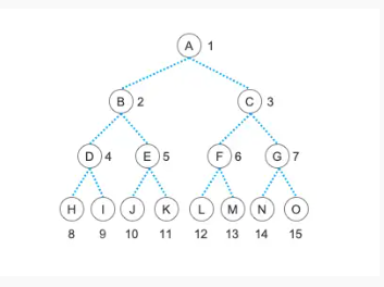 A 结点的下标是 1 ,它是我们的树根。它的子结点是 B 和 C ,对应的下标分别是 2 和 3 ,也就是 1 * 2 和 1 * 2 + 1 。